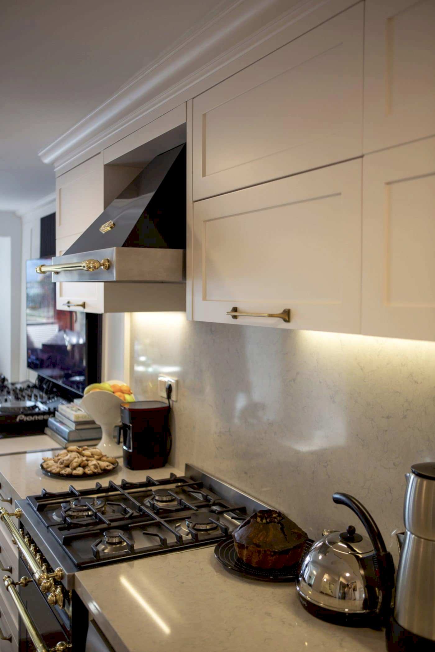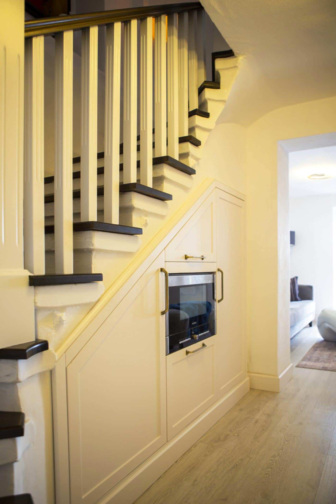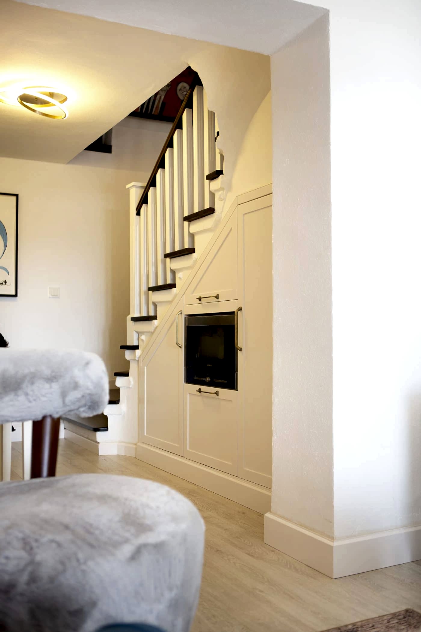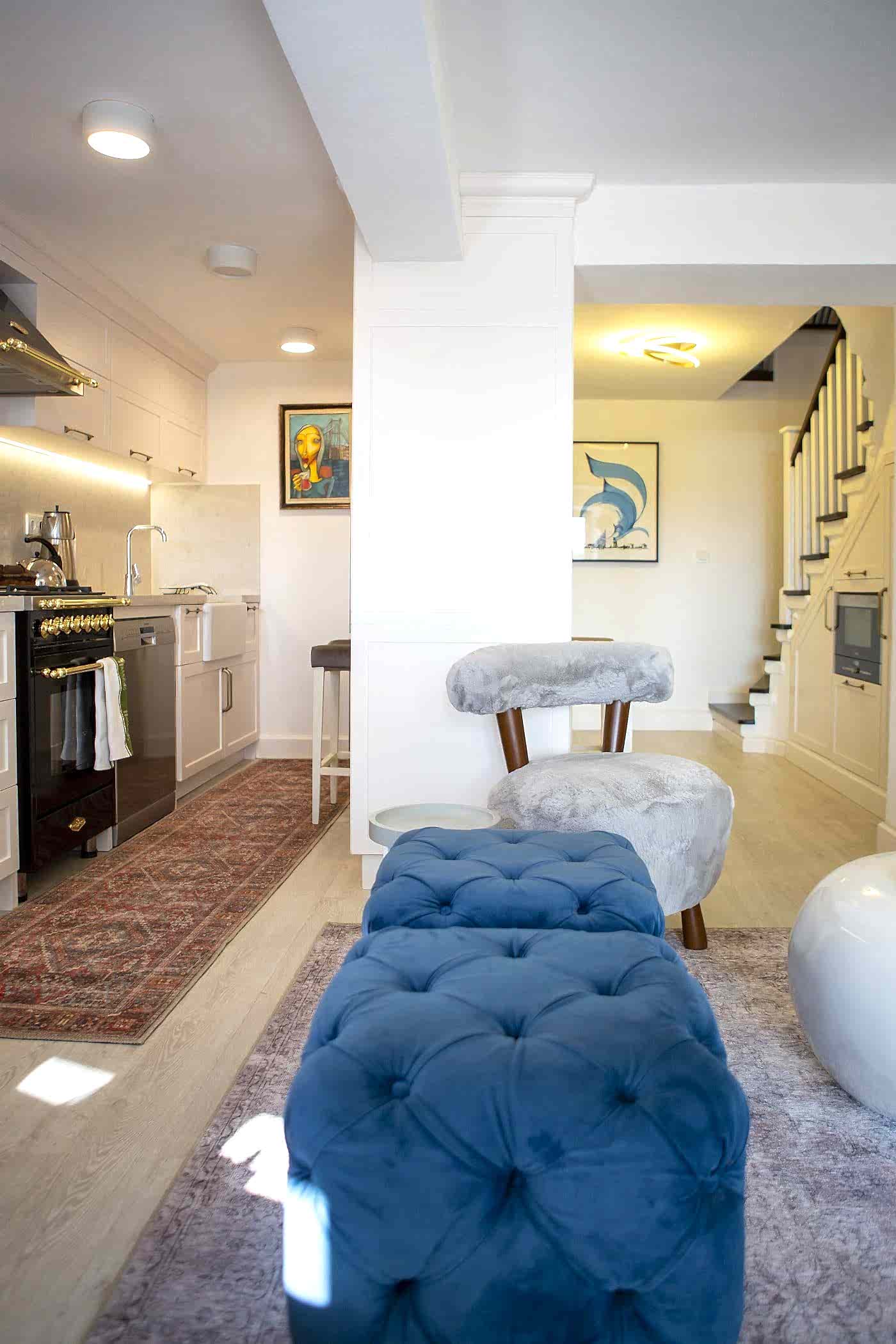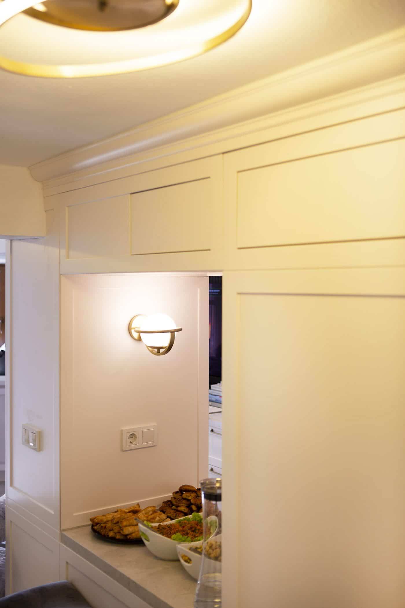 Güzel bir manzaraya sahip evin ışığını maksimum verim ile mekana yansıtmak amacıyla beyaz ahşapların yanında, tv alanını özelleştirdiğimiz antrasit pano ile mekana soluk getirildi. Öykü Hanım’ın zevkli mobilyaları ile tamamlanan projemiz bizim için keyifli bir tasarım ve uygulama süreci oldu.